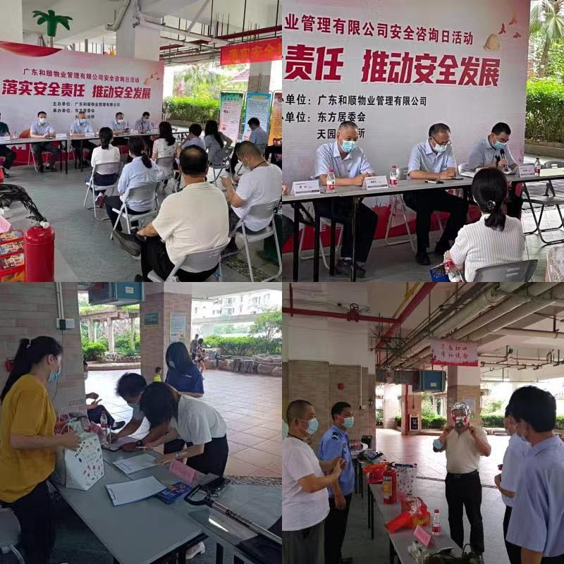 明确思路,夯实责任,坚决树牢安全生产理念,狠抓整改落实,强化风险防控,确保安全生产工作取得成效。和顺物业要求各项目做到以下几点:一是压实安全生产责任,充分重视疫情防控和生产安全相重叠的严峻性,筑牢安全防线,同时做好应对极端天气的防御措施,落实防台防汛工作,加强应急物资的储备和应急值守;二是日常安全要绝对保障,设备设施、配电房、电梯机房、消防设施、车辆管理、人员健康等方面进行全面排查;三是有序开展安全生产月各项活动,开展应急预案演练,开展特色安全大宣传等活动;四是要结合安全生产月活动落实“一线三排”,加强隐患排查治理,务必做到查隐患要查根,治隐患要治本,加强和业户的联动,确保沟通渠道畅通。